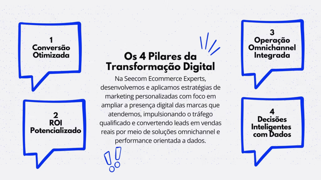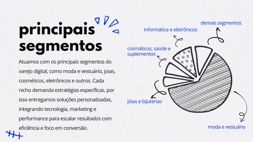 Unimos experiência em e-commerce, tecnologia e marketing para entregar soluções sob medida, sempre guiadas por dados e com foco real em performance. Nossa missão é clara: impulsionar marcas com inteligência digital e transformar desafios em vendas.